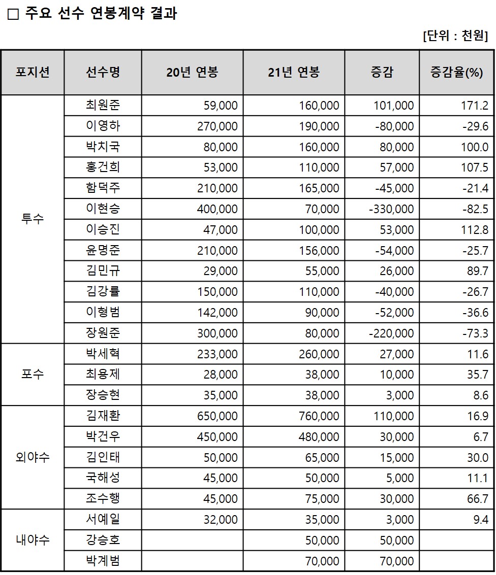 2021년 두산베어스 선수단 전체 연봉이 확정 되었네요.