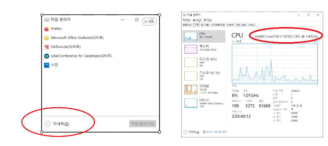 위에 보시면, CPU는 i7-8550U / 1.80GHZ 라고 사양이 확인이 가능합니다.